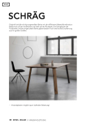 Originell sind die schräg ausgestellten Beine mit der raffinierten Materialkombination: Massivholz auf der Vorderseite und Stahl auf der Rückseite. Die Schrägkante der Tischplatte und die eingerückten Beine geben diesem Tisch eine leichte Erscheinung auch in großen Größen.
